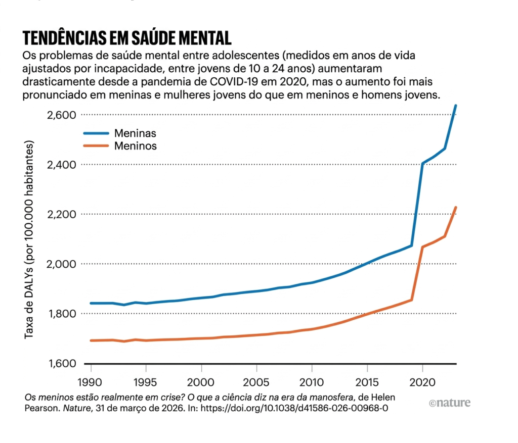 A reportagem da jornalista científica Helen Pearson, publicada em 31 de março de 2026 na Nature, analisa se a ideia de uma “crise dos meninos” reflete os dados disponíveis ou simplifica um cenário mais amplo.